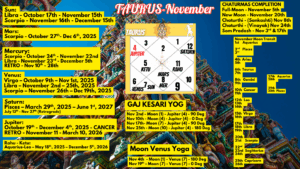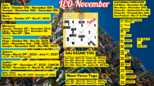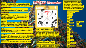 Saturn’s direct motion on Nov 27 breaks career barriers. Jupiter’s exaltation in Cancer boosts relationship luck. Venus enhances reputation through diplomacy. Mars gives behind-the-scenes strategy power.